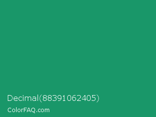 Decimal 88391062405 Color is a normal green color and the nearest color is Eucalyptus #278a5b. Hex code #199769 and RGB value is rgb(25,151,105). In RGB color space, this color is composed of 10% red, 59% green, 41% blue, In CMYK color space, this color is composed of 83% cyan, 0% magenta, 30% yellow , 41% black , In HSL color space, this color has a hue angle of 158° , 72% saturation and 35% lightness.