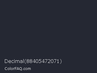 Decimal 88405472071 Color is a very dark blue color and the nearest color is Steel Gray #262335. Hex code #252833 and RGB value is rgb(37,40,51). In RGB color space, this color is composed of 15% red, 16% green, 20% blue, In CMYK color space, this color is composed of 27% cyan, 22% magenta, 0% yellow , 80% black , In HSL color space, this color has a hue angle of 227° , 16% saturation and 17% lightness.