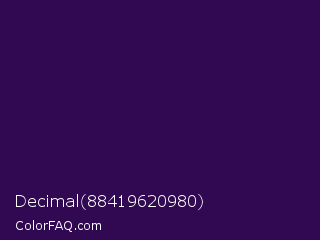 Decimal 88419620980 Color is a very dark purple color and the nearest color is Jagger #350e57. Hex code #310952 and RGB value is rgb(49,9,82). In RGB color space, this color is composed of 19% red, 4% green, 32% blue, In CMYK color space, this color is composed of 40% cyan, 89% magenta, 0% yellow , 68% black , In HSL color space, this color has a hue angle of 273° , 80% saturation and 18% lightness.