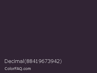 Decimal 88419673942 Color is a very dark purple color and the nearest color is Bleached Cedar #2c2133. Hex code #312434 and RGB value is rgb(49,36,52). In RGB color space, this color is composed of 19% red, 14% green, 20% blue, In CMYK color space, this color is composed of 6% cyan, 31% magenta, 0% yellow , 80% black , In HSL color space, this color has a hue angle of 289° , 18% saturation and 17% lightness.