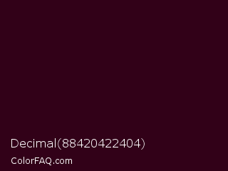Decimal 88420422404 Color is a very dark rose color and the nearest color is Toledo #3a0020. Hex code #320118 and RGB value is rgb(50,1,24). In RGB color space, this color is composed of 20% red, 0% green, 9% blue, In CMYK color space, this color is composed of 0% cyan, 98% magenta, 52% yellow , 80% black , In HSL color space, this color has a hue angle of 332° , 96% saturation and 10% lightness.