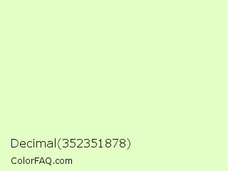 Decimal 352351878 Color is a very light green color and the nearest color is Snow Flurry #e4ffd1. Hex code #e4ffc6 and RGB value is rgb(228,255,198). In RGB color space, this color is composed of 89% red, 100% green, 78% blue, In CMYK color space, this color is composed of 11% cyan, 0% magenta, 22% yellow , 0% black , In HSL color space, this color has a hue angle of 88° , 100% saturation and 89% lightness.