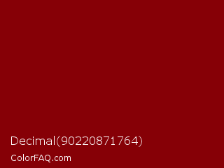 Decimal 90220871764 Color is a dark red color and the nearest color is Deep Red #850101. Hex code #860006 and RGB value is rgb(134,0,6). In RGB color space, this color is composed of 53% red, 0% green, 2% blue, In CMYK color space, this color is composed of 0% cyan, 100% magenta, 96% yellow , 47% black , In HSL color space, this color has a hue angle of 357° , 100% saturation and 26% lightness.