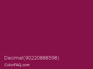 Decimal 90220888598 Color is a dark rose color and the nearest color is Rose Bud Cherry #800b47. Hex code #861048 and RGB value is rgb(134,16,72). In RGB color space, this color is composed of 53% red, 6% green, 28% blue, In CMYK color space, this color is composed of 0% cyan, 88% magenta, 46% yellow , 47% black , In HSL color space, this color has a hue angle of 332° , 79% saturation and 29% lightness.
