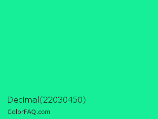 Decimal 22030450 Color is a normal green color and the nearest color is Medium Spring Green #00fa9a. Hex code #16ee98 and RGB value is rgb(22,238,152). In RGB color space, this color is composed of 9% red, 93% green, 60% blue, In CMYK color space, this color is composed of 91% cyan, 0% magenta, 36% yellow , 7% black , In HSL color space, this color has a hue angle of 156° , 86% saturation and 51% lightness.