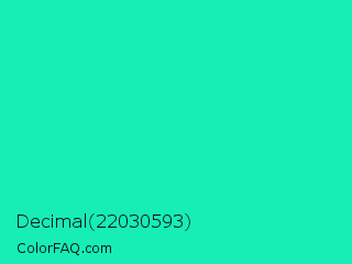 Decimal 22030593 Color is a normal cyan color and the nearest color is Medium Spring Green #00fa9a. Hex code #16eeb5 and RGB value is rgb(22,238,181). In RGB color space, this color is composed of 9% red, 93% green, 71% blue, In CMYK color space, this color is composed of 91% cyan, 0% magenta, 24% yellow , 7% black , In HSL color space, this color has a hue angle of 164° , 86% saturation and 51% lightness.