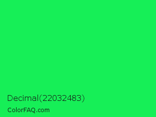 Decimal 22032483 Color is a normal green color and the nearest color is Malachite #0bda51. Hex code #16ef57 and RGB value is rgb(22,239,87). In RGB color space, this color is composed of 9% red, 94% green, 34% blue, In CMYK color space, this color is composed of 91% cyan, 0% magenta, 64% yellow , 6% black , In HSL color space, this color has a hue angle of 138° , 87% saturation and 51% lightness.
