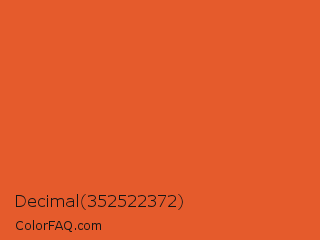 Decimal 352522372 Color is a normal color and the nearest color is Vivid Vermilion #e56024. Hex code #e55b2c and RGB value is rgb(229,91,44). In RGB color space, this color is composed of 90% red, 36% green, 17% blue, In CMYK color space, this color is composed of 0% cyan, 60% magenta, 81% yellow , 10% black , In HSL color space, this color has a hue angle of 15° , 78% saturation and 54% lightness.