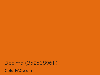Decimal 352538961 Color is a normal orange color and the nearest color is Christine #e7730a. Hex code #e56b0f and RGB value is rgb(229,107,15). In RGB color space, this color is composed of 90% red, 42% green, 6% blue, In CMYK color space, this color is composed of 0% cyan, 53% magenta, 93% yellow , 10% black , In HSL color space, this color has a hue angle of 26° , 88% saturation and 48% lightness.