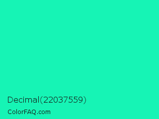 Decimal 22037559 Color is a normal green color and the nearest color is Medium Spring Green #00fa9a. Hex code #16f4b5 and RGB value is rgb(22,244,181). In RGB color space, this color is composed of 9% red, 96% green, 71% blue, In CMYK color space, this color is composed of 91% cyan, 0% magenta, 26% yellow , 4% black , In HSL color space, this color has a hue angle of 163° , 91% saturation and 52% lightness.