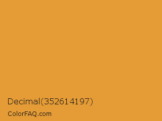 Decimal 352614197 Color is a normal orange color and the nearest color is Fire Bush #e89928. Hex code #e59c37 and RGB value is rgb(229,156,55). In RGB color space, this color is composed of 90% red, 61% green, 22% blue, In CMYK color space, this color is composed of 0% cyan, 32% magenta, 76% yellow , 10% black , In HSL color space, this color has a hue angle of 35° , 77% saturation and 56% lightness.