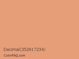Decimal 352617234 Color is a light orange color and the nearest color is Dark Salmon #e9967a. Hex code #e59e78 and RGB value is rgb(229,158,120). In RGB color space, this color is composed of 90% red, 62% green, 47% blue, In CMYK color space, this color is composed of 0% cyan, 31% magenta, 48% yellow , 10% black , In HSL color space, this color has a hue angle of 21° , 68% saturation and 68% lightness.