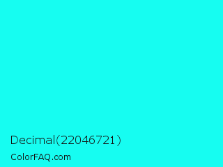 Decimal 22046721 Color is a normal cyan color and the nearest color is Loeen #15f2fd. Hex code #16fdf1 and RGB value is rgb(22,253,241). In RGB color space, this color is composed of 9% red, 99% green, 95% blue, In CMYK color space, this color is composed of 91% cyan, 0% magenta, 5% yellow , 1% black , In HSL color space, this color has a hue angle of 177° , 98% saturation and 54% lightness.
