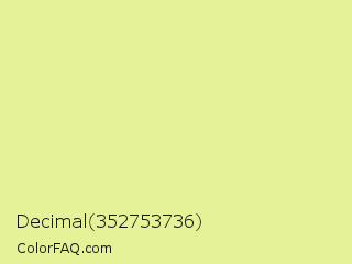 Decimal 352753736 Color is a light yellow color and the nearest color is Primrose #edea99. Hex code #e5f298 and RGB value is rgb(229,242,152). In RGB color space, this color is composed of 90% red, 95% green, 60% blue, In CMYK color space, this color is composed of 5% cyan, 0% magenta, 37% yellow , 5% black , In HSL color space, this color has a hue angle of 69° , 78% saturation and 77% lightness.