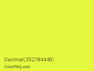 Decimal 352784448 Color is a light yellow color and the nearest color is Starship #ecf245. Hex code #e5f740 and RGB value is rgb(229,247,64). In RGB color space, this color is composed of 90% red, 97% green, 25% blue, In CMYK color space, this color is composed of 7% cyan, 0% magenta, 74% yellow , 3% black , In HSL color space, this color has a hue angle of 66° , 92% saturation and 61% lightness.