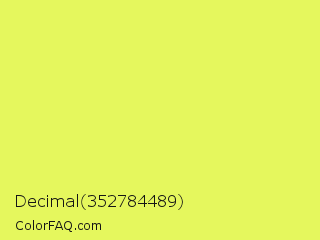 Decimal 352784489 Color is a light yellow color and the nearest color is Canary #f3fb62. Hex code #e5f75d and RGB value is rgb(229,247,93). In RGB color space, this color is composed of 90% red, 97% green, 36% blue, In CMYK color space, this color is composed of 7% cyan, 0% magenta, 62% yellow , 3% black , In HSL color space, this color has a hue angle of 67° , 91% saturation and 67% lightness.