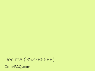 Decimal 352786688 Color is a light lime color and the nearest color is Jonquil #eeff9a. Hex code #e5fa9c and RGB value is rgb(229,250,156). In RGB color space, this color is composed of 90% red, 98% green, 61% blue, In CMYK color space, this color is composed of 8% cyan, 0% magenta, 38% yellow , 2% black , In HSL color space, this color has a hue angle of 73° , 90% saturation and 80% lightness.