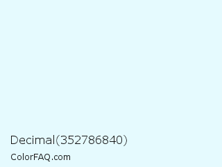 Decimal 352786840 Color is a almost white cyan color and the nearest color is Lily White #e7f8ff. Hex code #e5fafe and RGB value is rgb(229,250,254). In RGB color space, this color is composed of 90% red, 98% green, 100% blue, In CMYK color space, this color is composed of 10% cyan, 2% magenta, 0% yellow , 0% black , In HSL color space, this color has a hue angle of 190° , 93% saturation and 95% lightness.