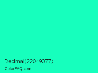 Decimal 22049377 Color is a normal green color and the nearest color is Medium Spring Green #00fa9a. Hex code #16ffbd and RGB value is rgb(22,255,189). In RGB color space, this color is composed of 9% red, 100% green, 74% blue, In CMYK color space, this color is composed of 91% cyan, 0% magenta, 26% yellow , 0% black , In HSL color space, this color has a hue angle of 163° , 100% saturation and 54% lightness.