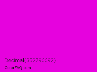 Decimal 352796692 Color is a normal magenta color and the nearest color is Purple Pizzazz #ff00cc. Hex code #e602de and RGB value is rgb(230,2,222). In RGB color space, this color is composed of 90% red, 1% green, 87% blue, In CMYK color space, this color is composed of 0% cyan, 99% magenta, 3% yellow , 10% black , In HSL color space, this color has a hue angle of 302° , 98% saturation and 45% lightness.