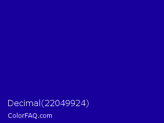 Decimal 22049924 Color is a normal indigo color and the nearest color is Ultramarine #120a8f. Hex code #17009c and RGB value is rgb(23,0,156). In RGB color space, this color is composed of 9% red, 0% green, 61% blue, In CMYK color space, this color is composed of 85% cyan, 100% magenta, 0% yellow , 39% black , In HSL color space, this color has a hue angle of 249° , 100% saturation and 31% lightness.