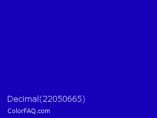 Decimal 22050665 Color is a normal indigo color and the nearest color is Dark Blue #0000c8. Hex code #1701b9 and RGB value is rgb(23,1,185). In RGB color space, this color is composed of 9% red, 0% green, 73% blue, In CMYK color space, this color is composed of 88% cyan, 99% magenta, 0% yellow , 27% black , In HSL color space, this color has a hue angle of 247° , 99% saturation and 36% lightness.