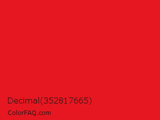Decimal 352817665 Color is a normal red color and the nearest color is Lust #e62020. Hex code #e61721 and RGB value is rgb(230,23,33). In RGB color space, this color is composed of 90% red, 9% green, 13% blue, In CMYK color space, this color is composed of 0% cyan, 90% magenta, 86% yellow , 10% black , In HSL color space, this color has a hue angle of 357° , 82% saturation and 50% lightness.