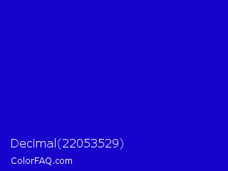 Decimal 22053529 Color is a normal indigo color and the nearest color is Medium Blue #0000cd. Hex code #1703cb and RGB value is rgb(23,3,203). In RGB color space, this color is composed of 9% red, 1% green, 80% blue, In CMYK color space, this color is composed of 89% cyan, 99% magenta, 0% yellow , 20% black , In HSL color space, this color has a hue angle of 246° , 97% saturation and 40% lightness.