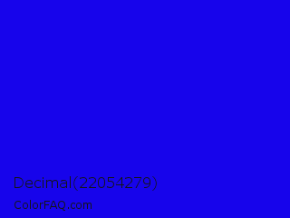 Decimal 22054279 Color is a normal indigo color and the nearest color is Bluebonnet #1c1cf0. Hex code #1704eb and RGB value is rgb(23,4,235). In RGB color space, this color is composed of 9% red, 2% green, 92% blue, In CMYK color space, this color is composed of 90% cyan, 98% magenta, 0% yellow , 8% black , In HSL color space, this color has a hue angle of 245° , 97% saturation and 47% lightness.
