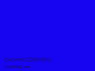 Decimal 22054291 Color is a normal indigo color and the nearest color is Bluebonnet #1c1cf0. Hex code #1704f1 and RGB value is rgb(23,4,241). In RGB color space, this color is composed of 9% red, 2% green, 95% blue, In CMYK color space, this color is composed of 90% cyan, 98% magenta, 0% yellow , 5% black , In HSL color space, this color has a hue angle of 245° , 97% saturation and 48% lightness.
