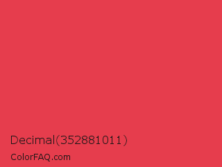Decimal 352881011 Color is a normal red color and the nearest color is Desire #ea3c53. Hex code #e63d4d and RGB value is rgb(230,61,77). In RGB color space, this color is composed of 90% red, 24% green, 30% blue, In CMYK color space, this color is composed of 0% cyan, 73% magenta, 67% yellow , 10% black , In HSL color space, this color has a hue angle of 354° , 77% saturation and 57% lightness.
