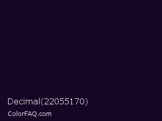Decimal 22055170 Color is a almost black purple color and the nearest color is Deep Ebony #0c0b1d. Hex code #170626 and RGB value is rgb(23,6,38). In RGB color space, this color is composed of 9% red, 2% green, 15% blue, In CMYK color space, this color is composed of 39% cyan, 84% magenta, 0% yellow , 85% black , In HSL color space, this color has a hue angle of 272° , 73% saturation and 9% lightness.