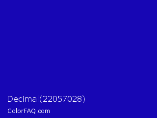 Decimal 22057028 Color is a normal indigo color and the nearest color is Zaffre #0014a8. Hex code #1706b4 and RGB value is rgb(23,6,180). In RGB color space, this color is composed of 9% red, 2% green, 71% blue, In CMYK color space, this color is composed of 87% cyan, 97% magenta, 0% yellow , 29% black , In HSL color space, this color has a hue angle of 246° , 94% saturation and 36% lightness.