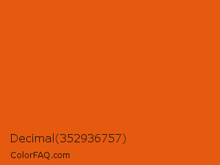 Decimal 352936757 Color is a normal orange color and the nearest color is Persimmon #ec5800. Hex code #e65a0f and RGB value is rgb(230,90,15). In RGB color space, this color is composed of 90% red, 35% green, 6% blue, In CMYK color space, this color is composed of 0% cyan, 61% magenta, 93% yellow , 10% black , In HSL color space, this color has a hue angle of 21° , 88% saturation and 48% lightness.