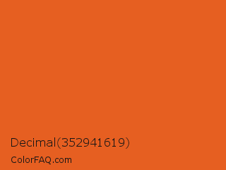 Decimal 352941619 Color is a normal orange color and the nearest color is Vivid Vermilion #e56024. Hex code #e65f21 and RGB value is rgb(230,95,33). In RGB color space, this color is composed of 90% red, 37% green, 13% blue, In CMYK color space, this color is composed of 0% cyan, 59% magenta, 86% yellow , 10% black , In HSL color space, this color has a hue angle of 19° , 80% saturation and 52% lightness.
