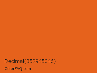 Decimal 352945046 Color is a normal orange color and the nearest color is Vivid Vermilion #e56024. Hex code #e6621c and RGB value is rgb(230,98,28). In RGB color space, this color is composed of 90% red, 38% green, 11% blue, In CMYK color space, this color is composed of 0% cyan, 57% magenta, 88% yellow , 10% black , In HSL color space, this color has a hue angle of 21° , 80% saturation and 51% lightness.