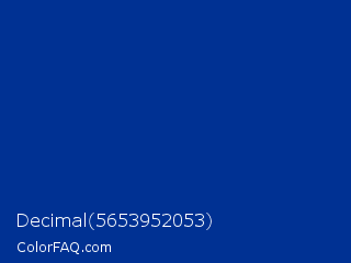 Decimal 5653952053 Color is a dark blue color and the nearest color is Air Force Blue USAF #00308f. Hex code #003193 and RGB value is rgb(0,49,147). In RGB color space, this color is composed of 0% red, 19% green, 58% blue, In CMYK color space, this color is composed of 100% cyan, 67% magenta, 0% yellow , 42% black , In HSL color space, this color has a hue angle of 220° , 100% saturation and 29% lightness.