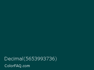 Decimal 5653993736 Color is a very dark cyan color and the nearest color is Warm Black #004242. Hex code #004244 and RGB value is rgb(0,66,68). In RGB color space, this color is composed of 0% red, 26% green, 27% blue, In CMYK color space, this color is composed of 100% cyan, 3% magenta, 0% yellow , 73% black , In HSL color space, this color has a hue angle of 182° , 100% saturation and 13% lightness.