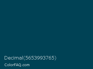 Decimal 5653993765 Color is a very dark cyan color and the nearest color is Teal Blue #044259. Hex code #004255 and RGB value is rgb(0,66,85). In RGB color space, this color is composed of 0% red, 26% green, 33% blue, In CMYK color space, this color is composed of 100% cyan, 22% magenta, 0% yellow , 67% black , In HSL color space, this color has a hue angle of 193° , 100% saturation and 17% lightness.
