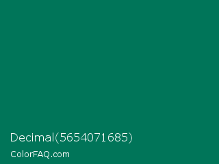 Decimal 5654071685 Color is a dark cyan color and the nearest color is Tropical Rain Forest #00755e. Hex code #007559 and RGB value is rgb(0,117,89). In RGB color space, this color is composed of 0% red, 46% green, 35% blue, In CMYK color space, this color is composed of 100% cyan, 0% magenta, 24% yellow , 54% black , In HSL color space, this color has a hue angle of 166° , 100% saturation and 23% lightness.