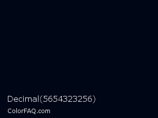 Decimal 5654323256 Color is a almost black blue color and the nearest color is Rich Black FOGRA29 #010b13. Hex code #010616 and RGB value is rgb(1,6,22). In RGB color space, this color is composed of 0% red, 2% green, 9% blue, In CMYK color space, this color is composed of 95% cyan, 73% magenta, 0% yellow , 91% black , In HSL color space, this color has a hue angle of 226° , 91% saturation and 5% lightness.
