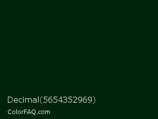 Decimal 5654352969 Color is a almost black green color and the nearest color is Palm Green #09230f. Hex code #012309 and RGB value is rgb(1,35,9). In RGB color space, this color is composed of 0% red, 14% green, 4% blue, In CMYK color space, this color is composed of 97% cyan, 0% magenta, 74% yellow , 86% black , In HSL color space, this color has a hue angle of 134° , 94% saturation and 7% lightness.