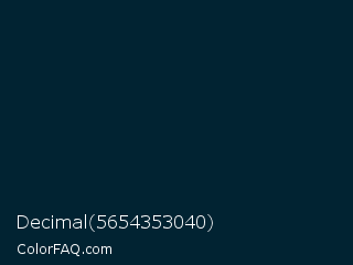 Decimal 5654353040 Color is a very dark blue color and the nearest color is Daintree #012731. Hex code #012332 and RGB value is rgb(1,35,50). In RGB color space, this color is composed of 0% red, 14% green, 20% blue, In CMYK color space, this color is composed of 98% cyan, 30% magenta, 0% yellow , 80% black , In HSL color space, this color has a hue angle of 198° , 96% saturation and 10% lightness.