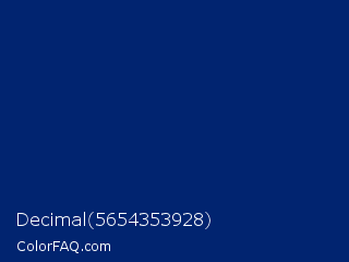 Decimal 5654353928 Color is a very dark blue color and the nearest color is Royal Blue #002366. Hex code #012470 and RGB value is rgb(1,36,112). In RGB color space, this color is composed of 0% red, 14% green, 44% blue, In CMYK color space, this color is composed of 99% cyan, 68% magenta, 0% yellow , 56% black , In HSL color space, this color has a hue angle of 221° , 98% saturation and 22% lightness.
