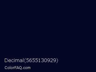 Decimal 5655130929 Color is a almost black blue color and the nearest color is Black Russian #0a001c. Hex code #020523 and RGB value is rgb(2,5,35). In RGB color space, this color is composed of 1% red, 2% green, 14% blue, In CMYK color space, this color is composed of 94% cyan, 86% magenta, 0% yellow , 86% black , In HSL color space, this color has a hue angle of 235° , 89% saturation and 7% lightness.