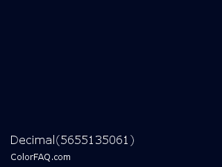 Decimal 5655135061 Color is a almost black blue color and the nearest color is Blue Charcoal #010d1a. Hex code #020923 and RGB value is rgb(2,9,35). In RGB color space, this color is composed of 1% red, 4% green, 14% blue, In CMYK color space, this color is composed of 94% cyan, 74% magenta, 0% yellow , 86% black , In HSL color space, this color has a hue angle of 227° , 89% saturation and 7% lightness.