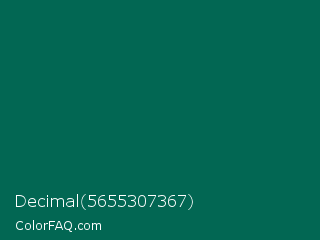 Decimal 5655307367 Color is a very dark cyan color and the nearest color is Bottle Green #006a4e. Hex code #026753 and RGB value is rgb(2,103,83). In RGB color space, this color is composed of 1% red, 40% green, 33% blue, In CMYK color space, this color is composed of 98% cyan, 0% magenta, 19% yellow , 60% black , In HSL color space, this color has a hue angle of 168° , 96% saturation and 21% lightness.