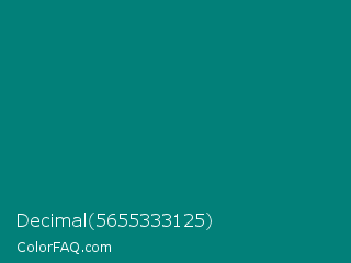 Decimal 5655333125 Color is a dark cyan color and the nearest color is Teal Green #00827f. Hex code #028079 and RGB value is rgb(2,128,121). In RGB color space, this color is composed of 1% red, 50% green, 47% blue, In CMYK color space, this color is composed of 98% cyan, 0% magenta, 5% yellow , 50% black , In HSL color space, this color has a hue angle of 177° , 97% saturation and 25% lightness.