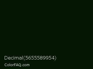 Decimal 5655589954 Color is a almost black green color and the nearest color is Midnight Moss #041004. Hex code #031702 and RGB value is rgb(3,23,2). In RGB color space, this color is composed of 1% red, 9% green, 1% blue, In CMYK color space, this color is composed of 87% cyan, 0% magenta, 91% yellow , 91% black , In HSL color space, this color has a hue angle of 117° , 84% saturation and 5% lightness.