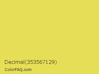 Decimal 353567129 Color is a light yellow color and the nearest color is Confetti #e9d75a. Hex code #e6de57 and RGB value is rgb(230,222,87). In RGB color space, this color is composed of 90% red, 87% green, 34% blue, In CMYK color space, this color is composed of 0% cyan, 3% magenta, 62% yellow , 10% black , In HSL color space, this color has a hue angle of 57° , 74% saturation and 62% lightness.